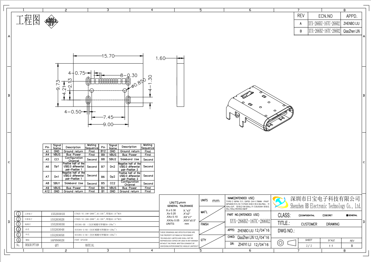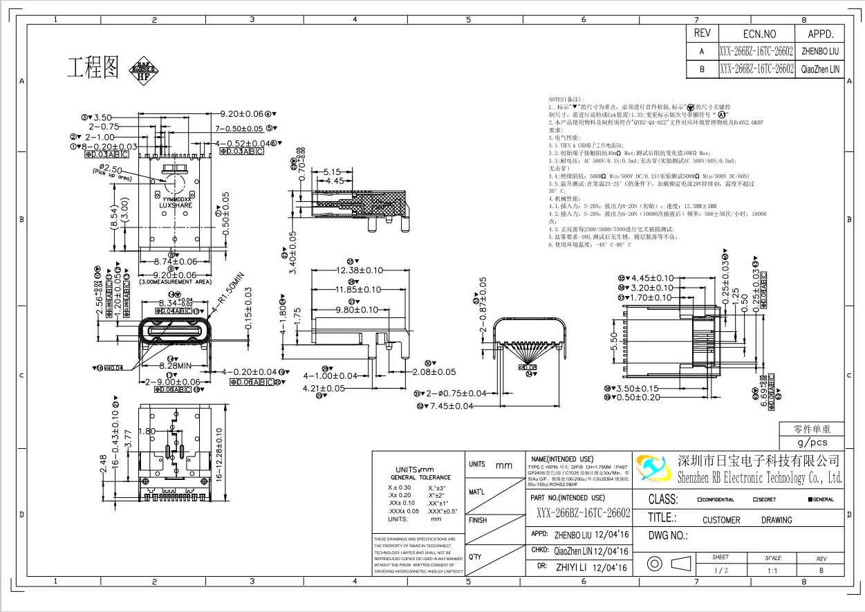 加長(zhǎng)TYPE C 16PIN母座 板上SMT 四腳插板 CH=1.75MM L=12.15MM 雙殼