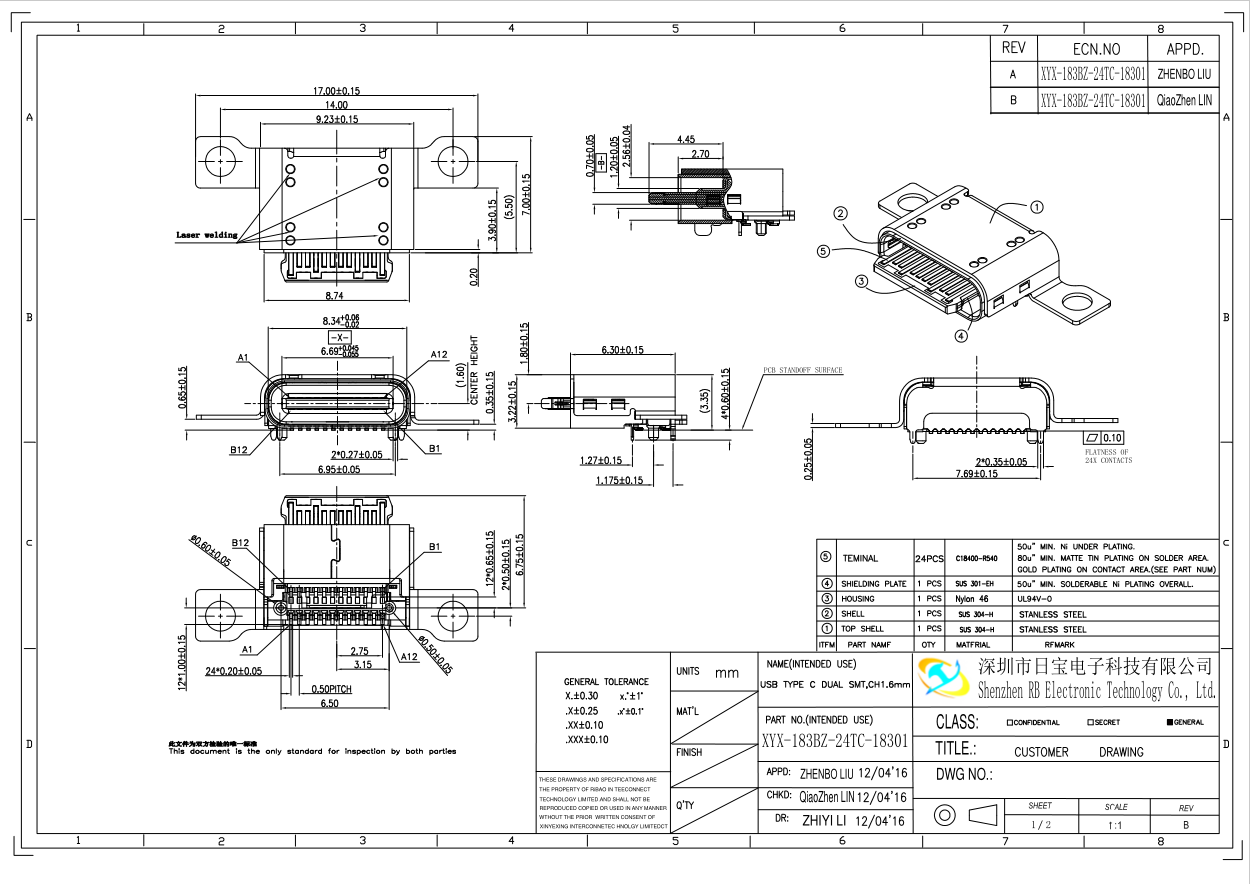 TYPE C 24P母座 板上雙貼SMT 舍片外漏 帶雙耳螺絲孔 CH=1.6MM L=7.55MM(華碩ROG2、3、5代游戲手機(jī)尾插)